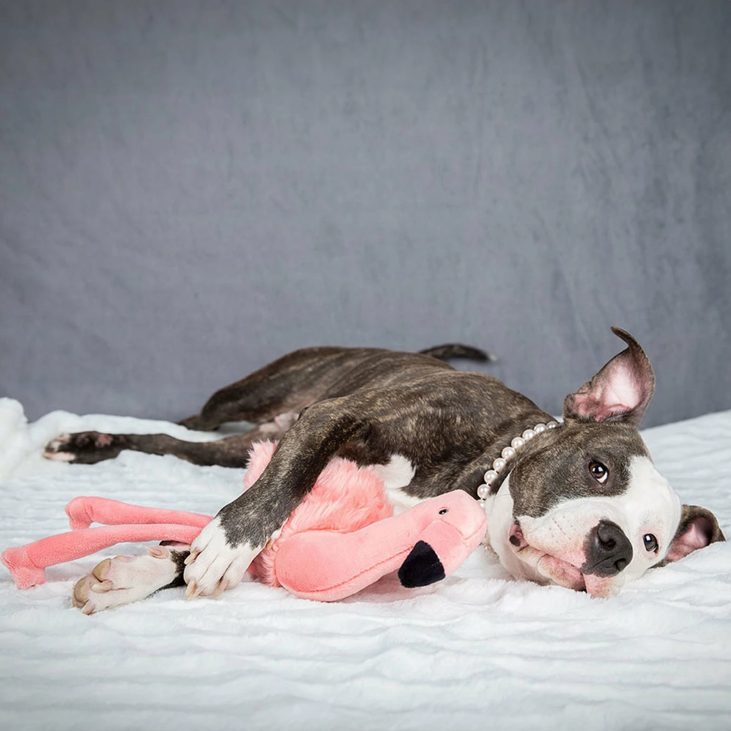 A group of flamingos is called a flamboyance, and Lola lives up to that! Her long legs and neck are perfect for dogs who want to shake and toss their toys.