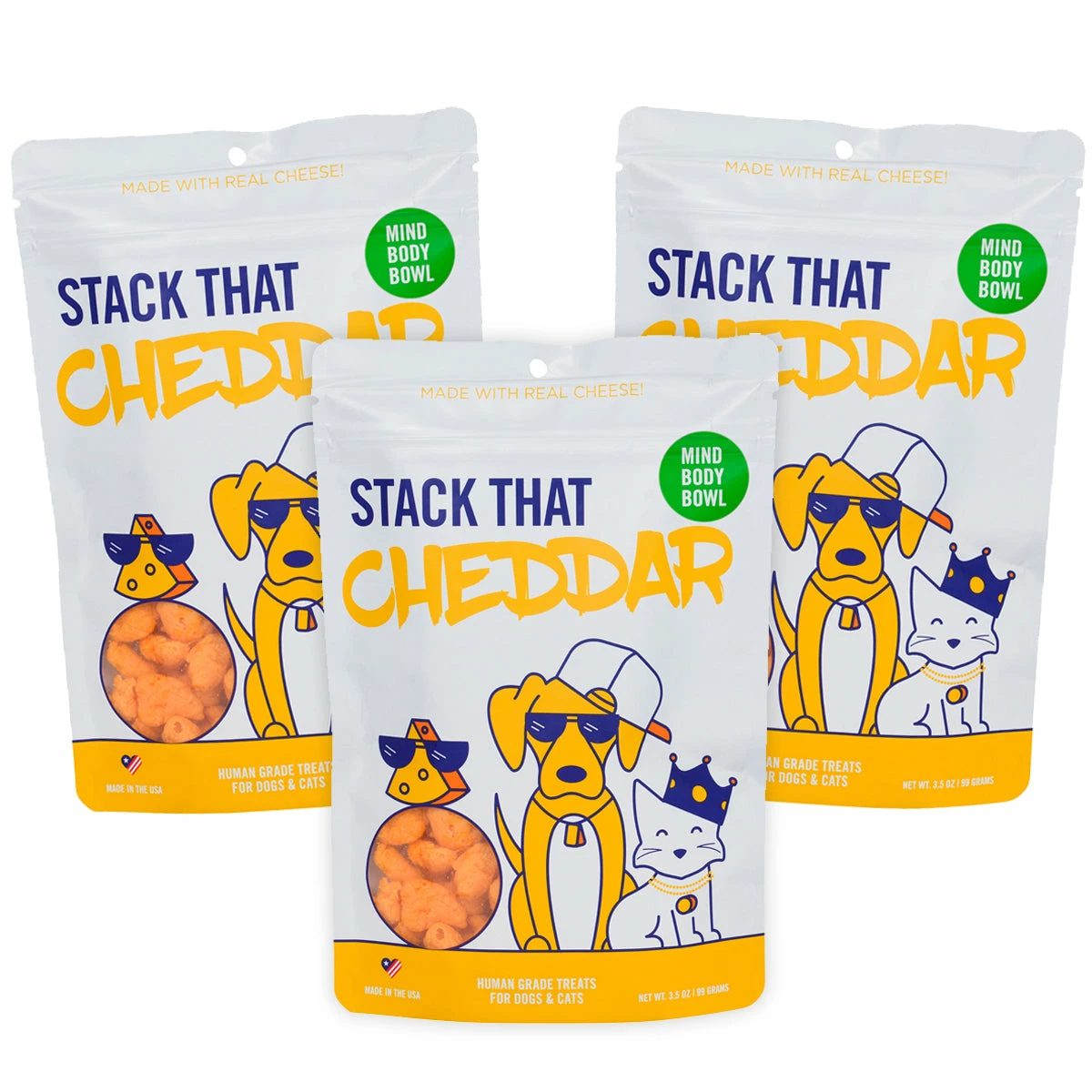 This is a 3-pack of MIND BODY BOWL Stack That Cheddar Cheese Dog Treats 2-Pack.