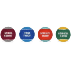 Traditional fetch has taken on a whole new look with P.L.A.Y.’s Tennis Ball Set Dog Toys. Each ball bounces, floats, squeaks, and comes with its own unique catchphrase!