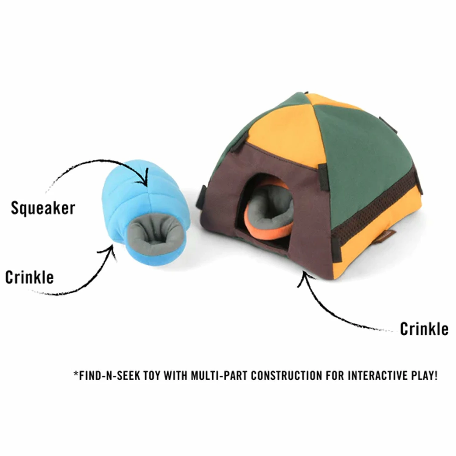 Celebrate the fun of camping with the Trailblazing Tent toy by P.L.A.Y. It features two removable sleeping bags with squeakers and crinkles and a crinkle tent for extra entertainment for your pup.Â