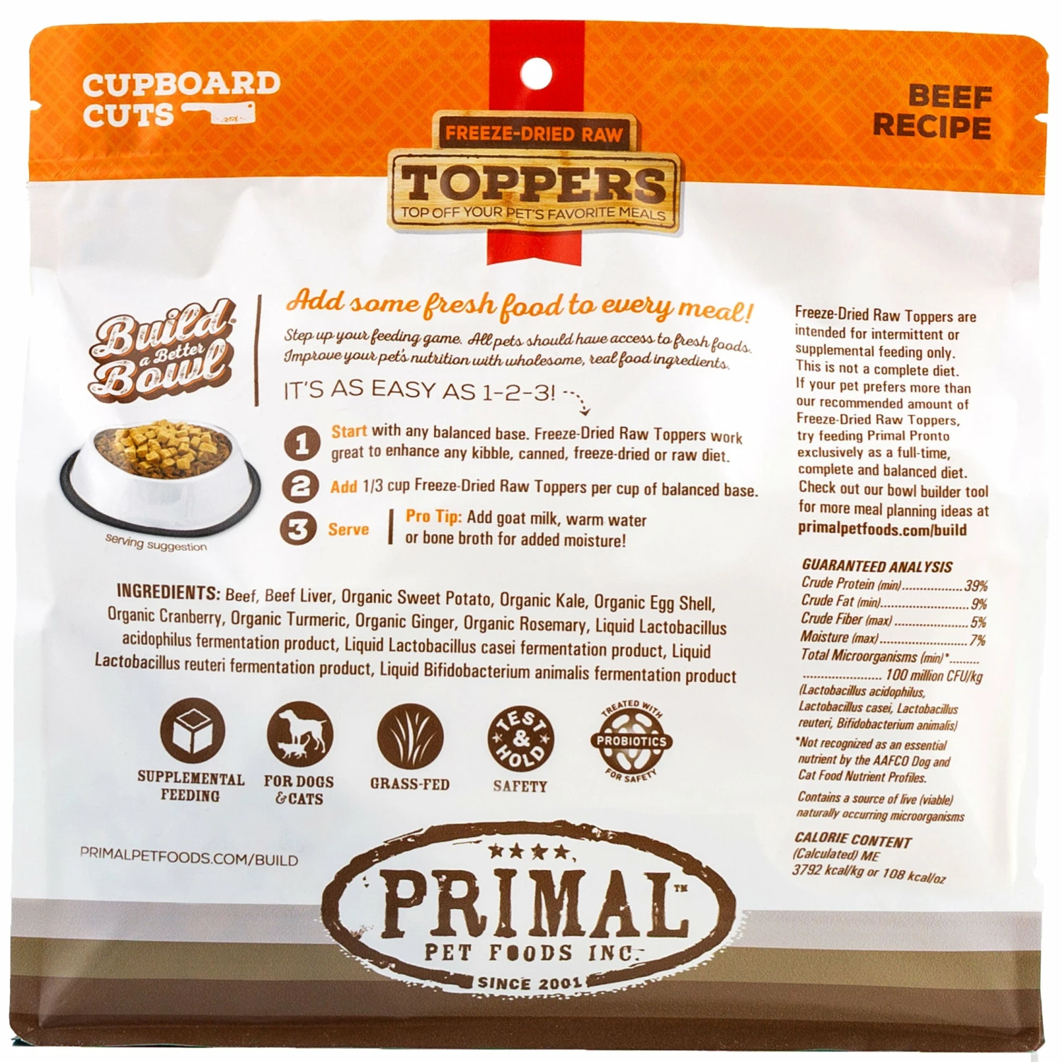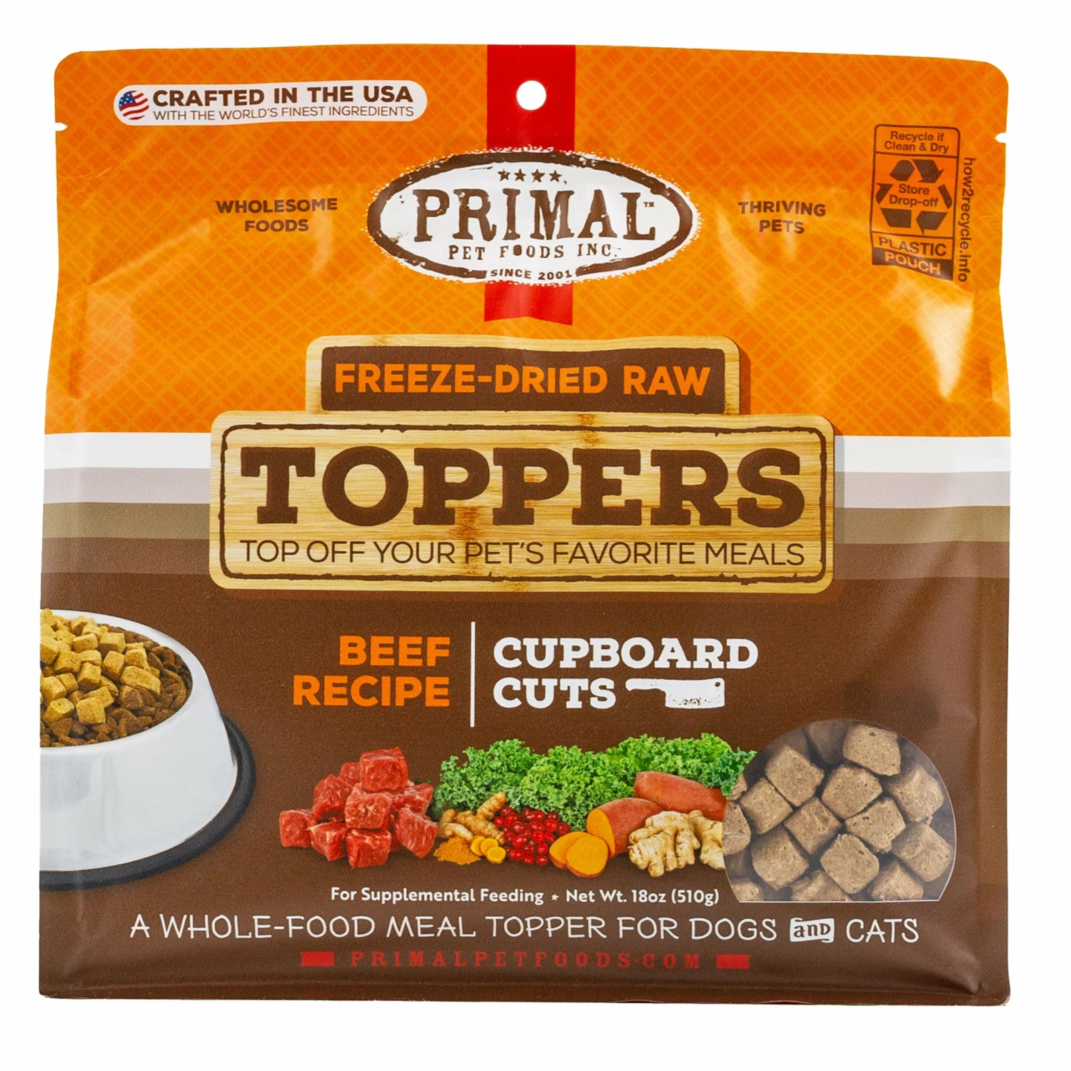 Primal’s NEW Freeze-Dried Raw Toppers can top off your pet’s meal or be served as a treat! Integrate Primal Cupboard Cuts Beef Dog Food Topper easily into your pet’s meals to increase their intake of wholesome, real food ingredients—whether your pet eats canned, kibble, raw, or a mix of all! These shelf-stable, easy-to-use toppers are made with high-quality meats & certified organic produce.