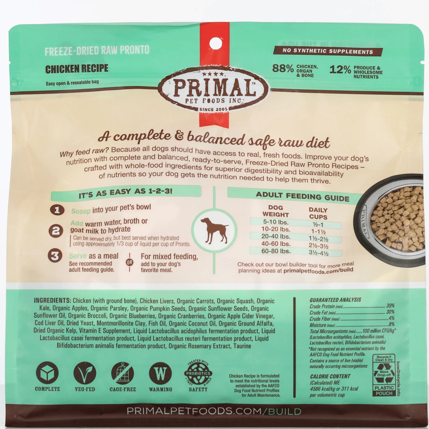 Primal Freeze-Dried Raw Pronto Dog Food makes it easy to serve your pup a raw diet! It provides all of the benefits of a raw diet in a shelf-stable, convenient format. All you have to do is serve, hydrate, and give to your dog to enjoy!