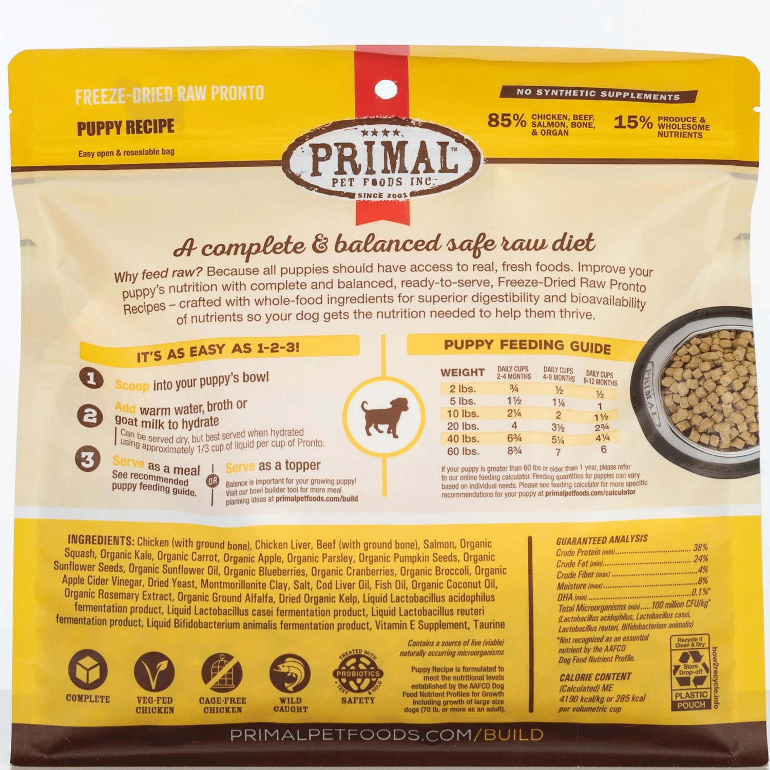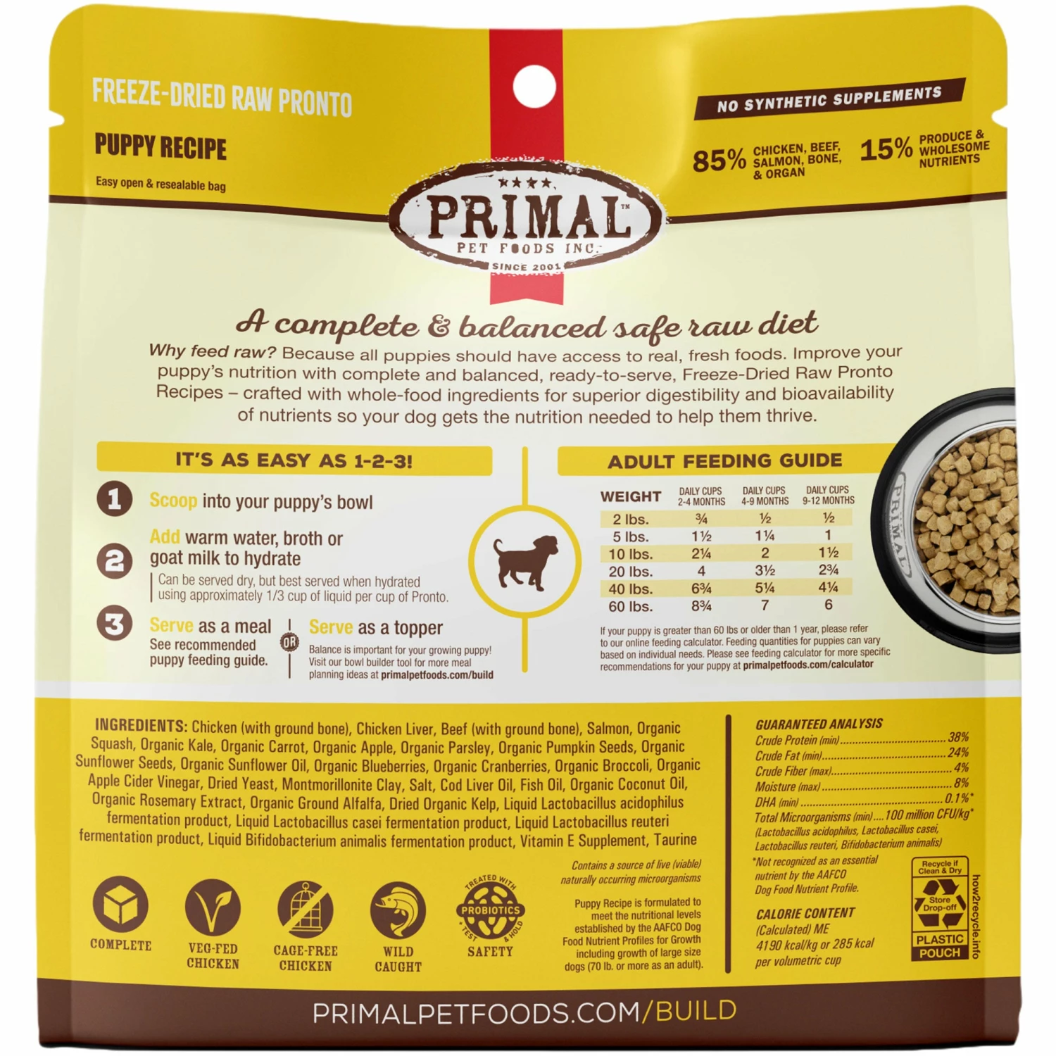 Primal Freeze-Dried Raw Pronto Dog Food makes it easy to serve your pup a raw diet! It provides all of the benefits of a raw diet in a shelf-stable, convenient format. All you have to do is serve, hydrate, and give to your dog to enjoy!