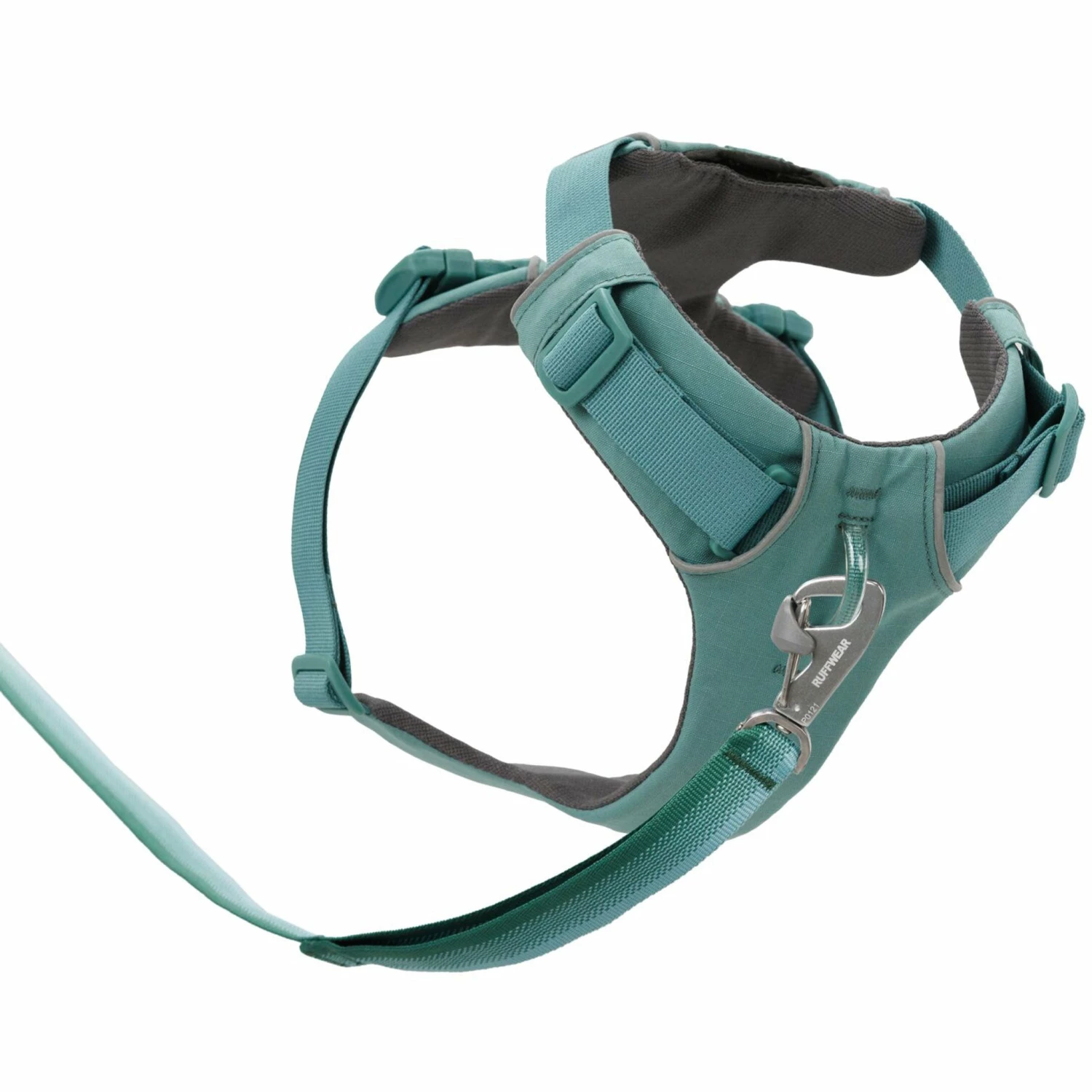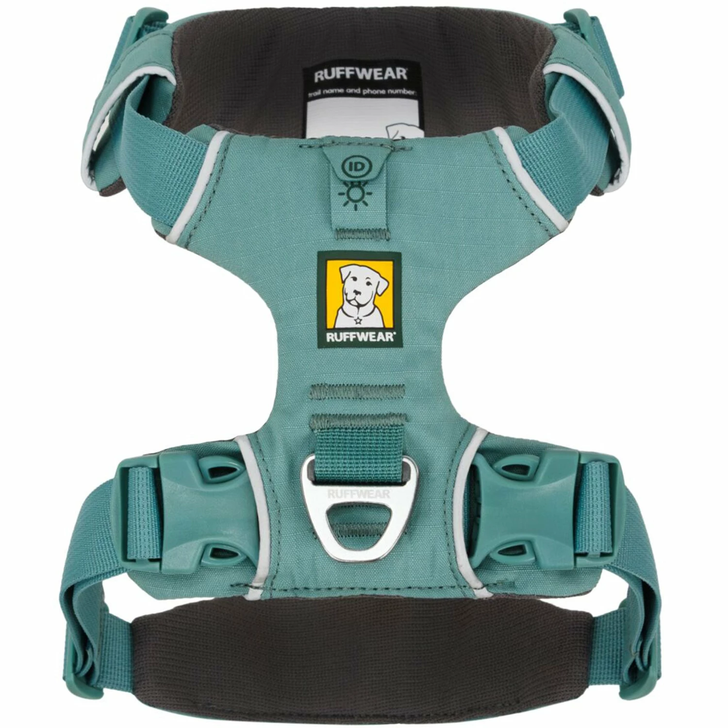 - Two leash attachment options: one polyester webbing ring on the front and one aluminum V-ring on the back