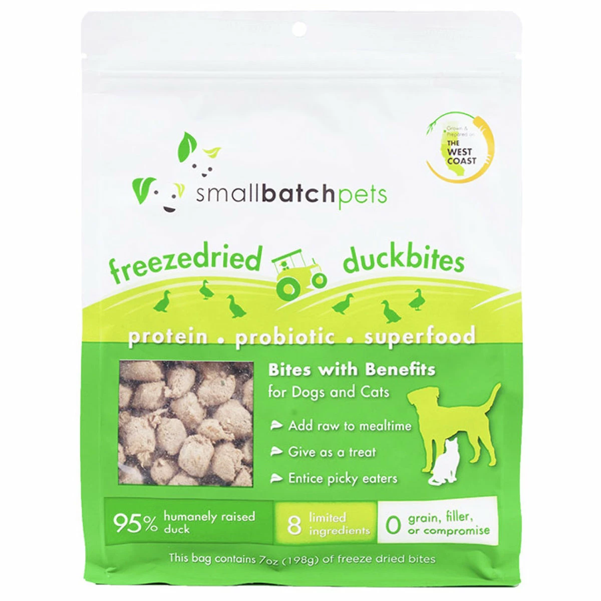 Small Batch bites are single-source protein treats for dogs and cats featuring 95% meat, organ and bone, fermented purple cabbage probiotic and a different superfood with each flavor. You can feed these as a snack, or as a topper to add raw nutrition.