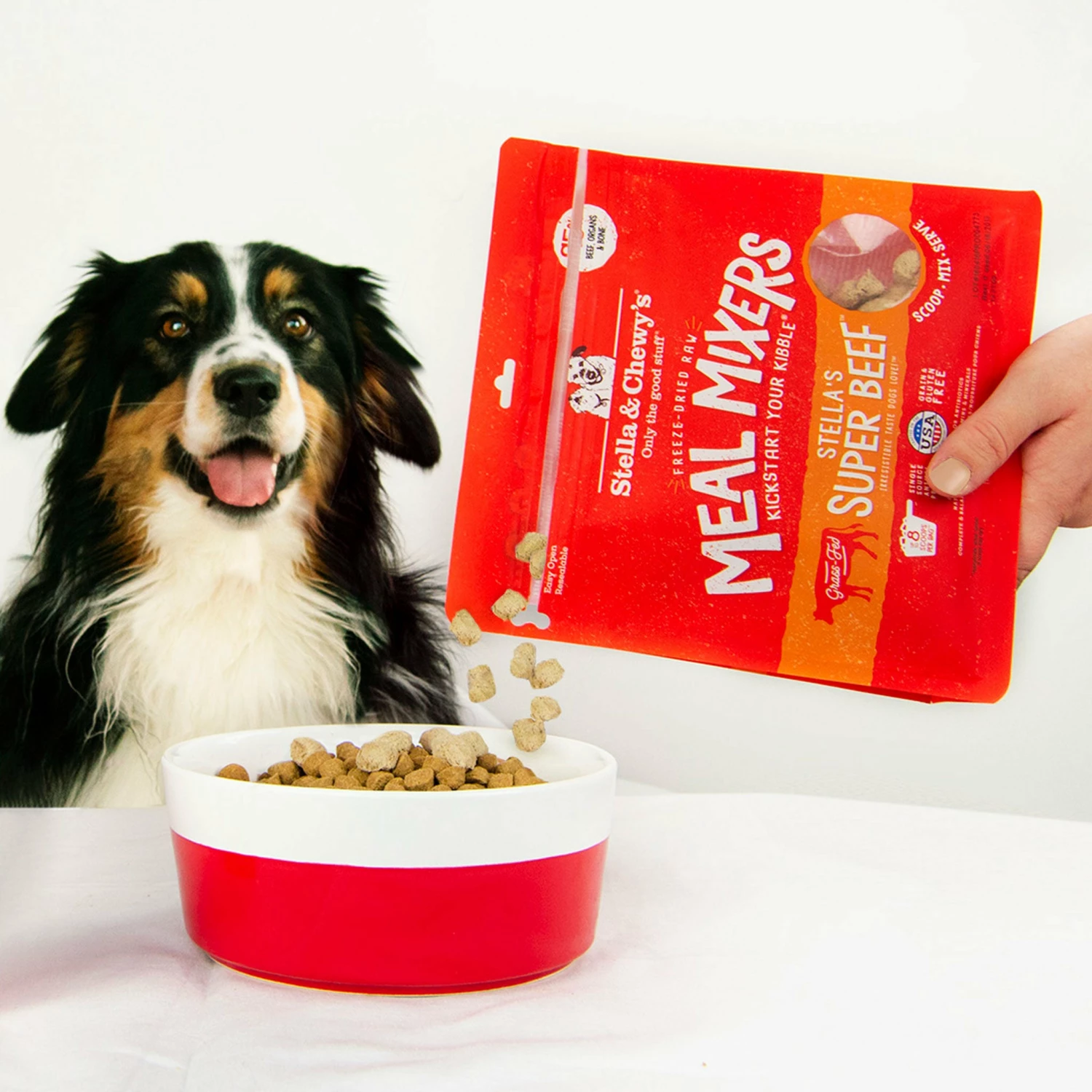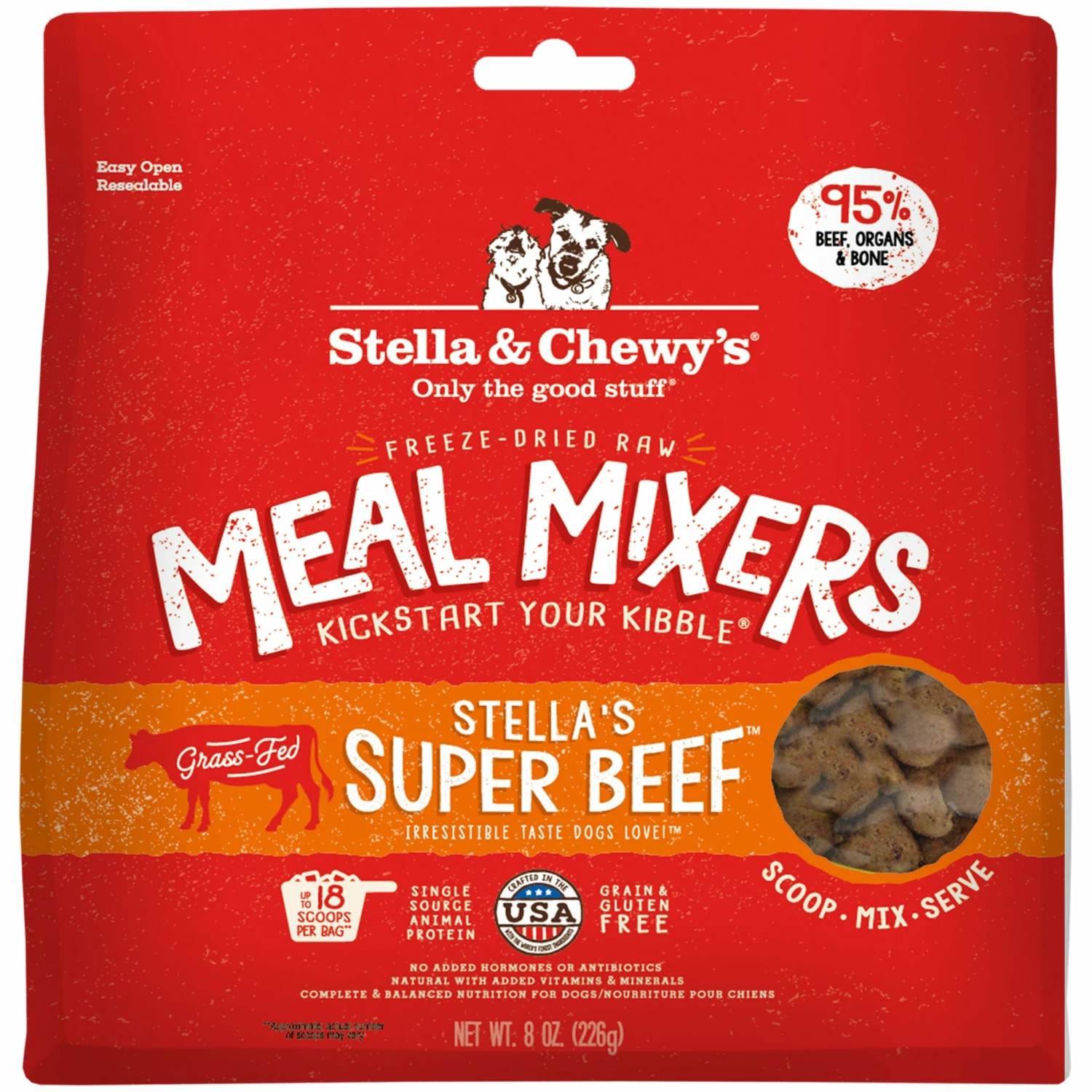 Boost the nutrition and palatability of your pet’s meal with Stella & Chewy’s Meal Mixers. This freeze dried mixer is easy to scoop and serve with any kibble or on its own as a complete diet. Meal Mixers are made with no added hormones or antibiotics along with organic fruits and vegetables, probiotics and antioxidants. Freeze-drying allows for minimal processing and preserves vital nutrients and maximizes palatability. Your furry friend will go crazy over this wholesome and scrumptious meal!