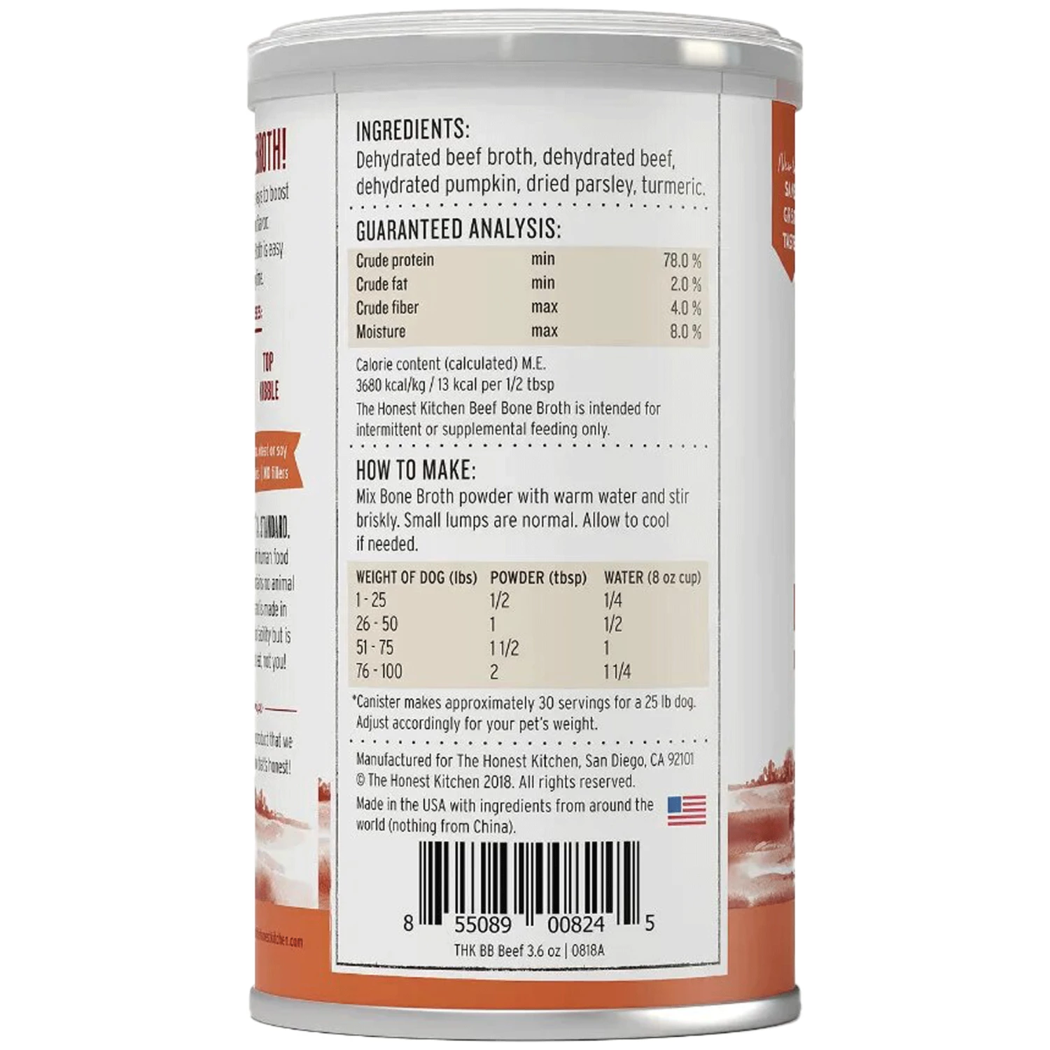 The Honest Kitchen’s Daily Booster Beef Bone Broth rehydrates your pet’s food with a rich and delectable flavor. This adds an extra boost of protein while working to strengthen your pet’s digestive and bone health. To serve, rehydrate with warm water and mix with your pet’s food or serve as a tasty treat in between meals.