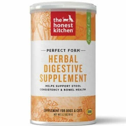 The Honest Kitchen Perfect Form Herbal Digestive Dog & Cat Supplement supports the normal healthy functioning of your dog or cat’s digestive tract. This pet nutrition supplement combats gas, facilitates regularity, firms up loose stools, and soothes and protects the GI Tract. Perfect Form is ideal for pets with Irritable Bowel Syndrome (IBS), Colitis or occasional digestive upset (diarrhea or vomiting). Use in conjunction with a grain-free diet for best results. It can be fed directly or mixed with food.